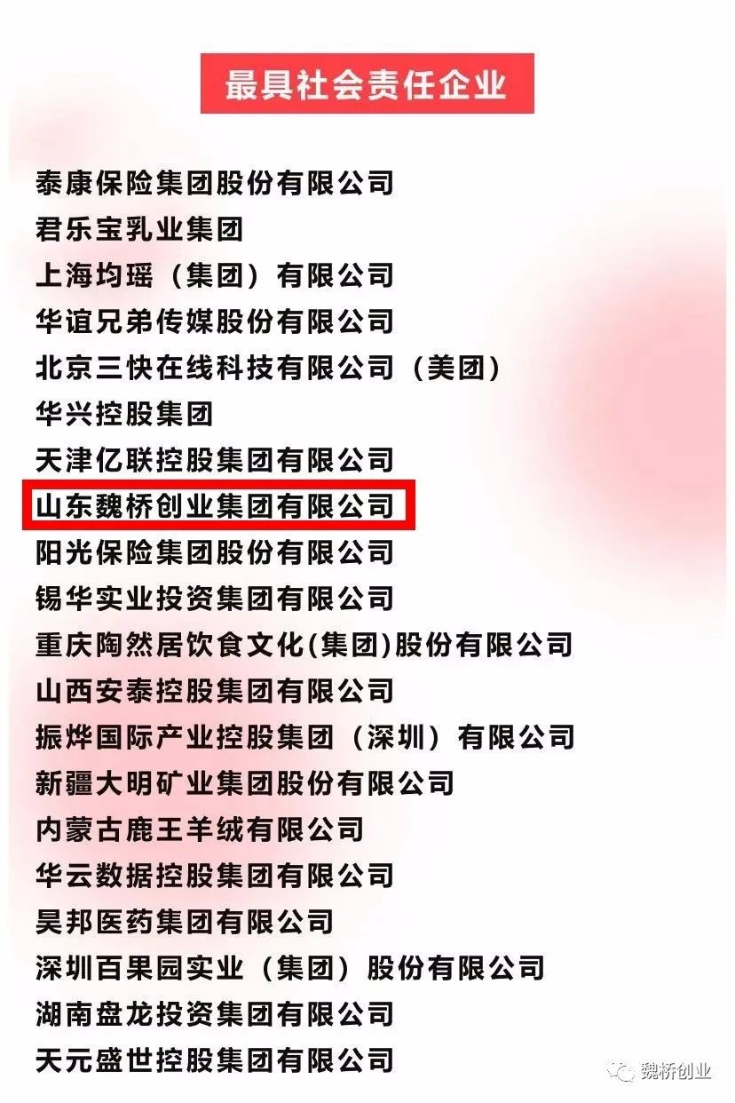 为深入贯彻落实党的十九大和十九届历次全会精神,引导广大民营企业立足新发展阶段、贯彻新发展理念、助力构建新发展格局,把广大民营经济人士紧紧团结在党的周围,更好推动“两个健康”,在高质量发展中扎实推动共同富裕,由中华工商时报社发起的2021年度“四个最具”企业推介活动,经过各地工商联、商会组织推荐和企业自荐,中华工商时报社“四个最具”推介委员会复核审定,最终产生2021“最具品牌力、最具成长力、最具创新力、最具社会责任”上榜企业名单,魏桥创业集团入选最具社会责任企业。